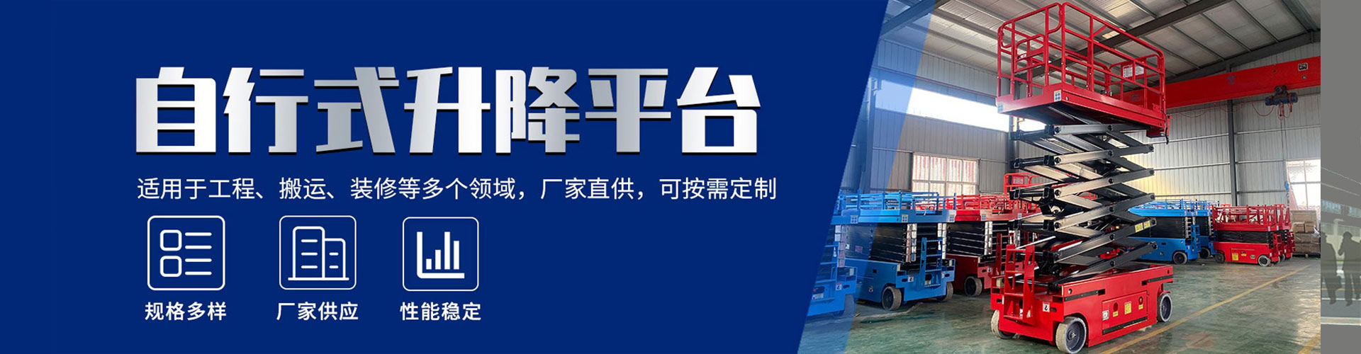 三、 由于受建筑物或工作搁层的 高度,所载物体的 重量、大小及其它使用要求的 影响,其型号有很多不确定因素。升降平台是一种多功能起重装卸机械设备,可分为固定式和移动式:移动式分为直臂式、曲臂式,剪叉式,桅柱式,铝合金升降平台,套缸式:固定式有剪叉式,导轨式升降平台、链条式升降平台、装卸平台 及附着式电动施工平台等。液压升降平台是一种多功能起重装卸机械设备。液压升降平台分为:四轮移动式升降平台、二轮牵引式升降平台、汽车改装式升降平台、手推式升降平台、手摇式升降平台、交直流两用升降平台、电瓶车载式升降平台、 起升高度从1米至30米不等。当列表所示型号不适合使用要求时,可根据实际使用环境和操作要求,对升降机的 升高、承载量、平台面积等进行组合,以便取得理想的 使用效果。